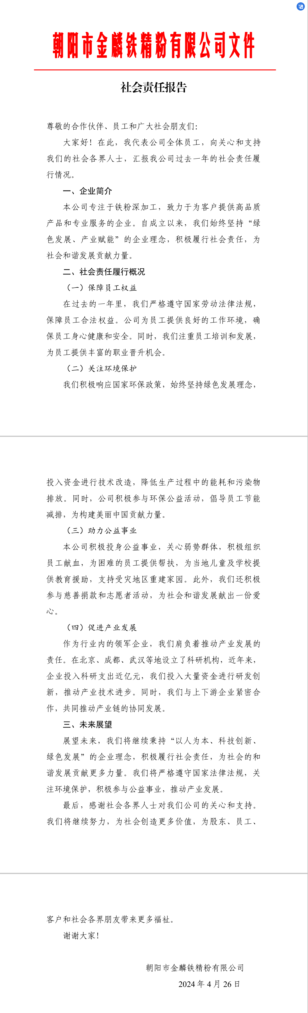 展望未來(lái),我們將繼續(xù)秉持“以人為本、科技創(chuàng)新、綠色發(fā)展”的企業(yè)理念,積極履行社會(huì)責(zé)任,為社會(huì)的和諧發(fā)展貢獻(xiàn)更多力量。我們將嚴(yán)格遵守國(guó)家法律法規(guī),關(guān)注環(huán)境保護(hù),積極參與公益事業(yè),推動(dòng)產(chǎn)業(yè)發(fā)展。
